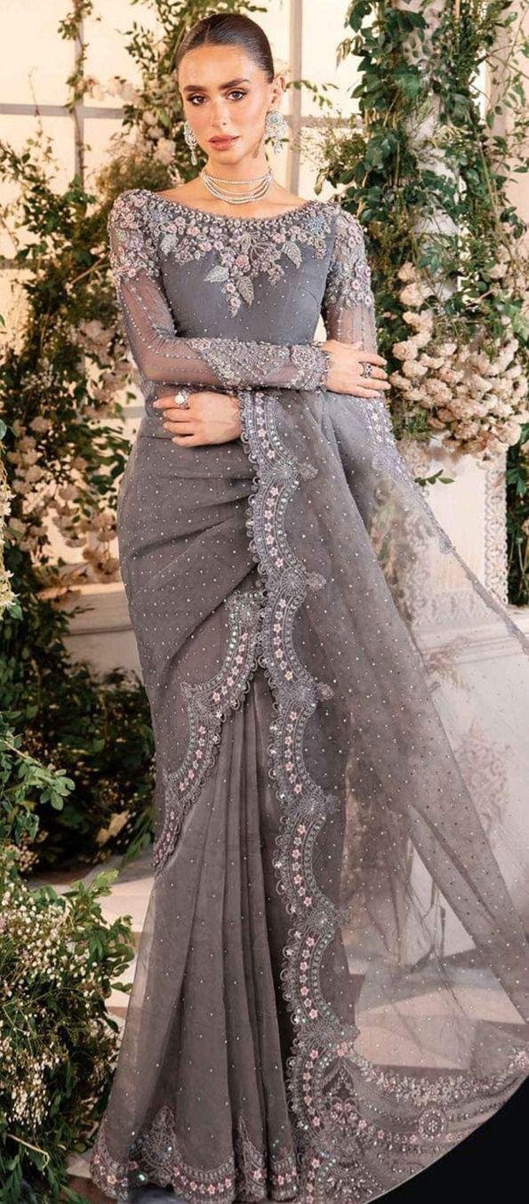 The highlight of this ensemble is the fully heavy jhall embroidered pallu, beautifully finished with cutwork borders and hanging tassels, creating a dramatic and elegant flow. The look is completed with a silk fabric petti coat, ensuring comfort and perfect drape.