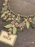 The neckline is heavily adorned with adda work on fabric, adding a statement finish to the outfit. Net sleeves are fully embroidered with heavy adda work, completed with cutwork embroidered cuffs and delicate hanging tassels, giving a luxurious festive appeal.