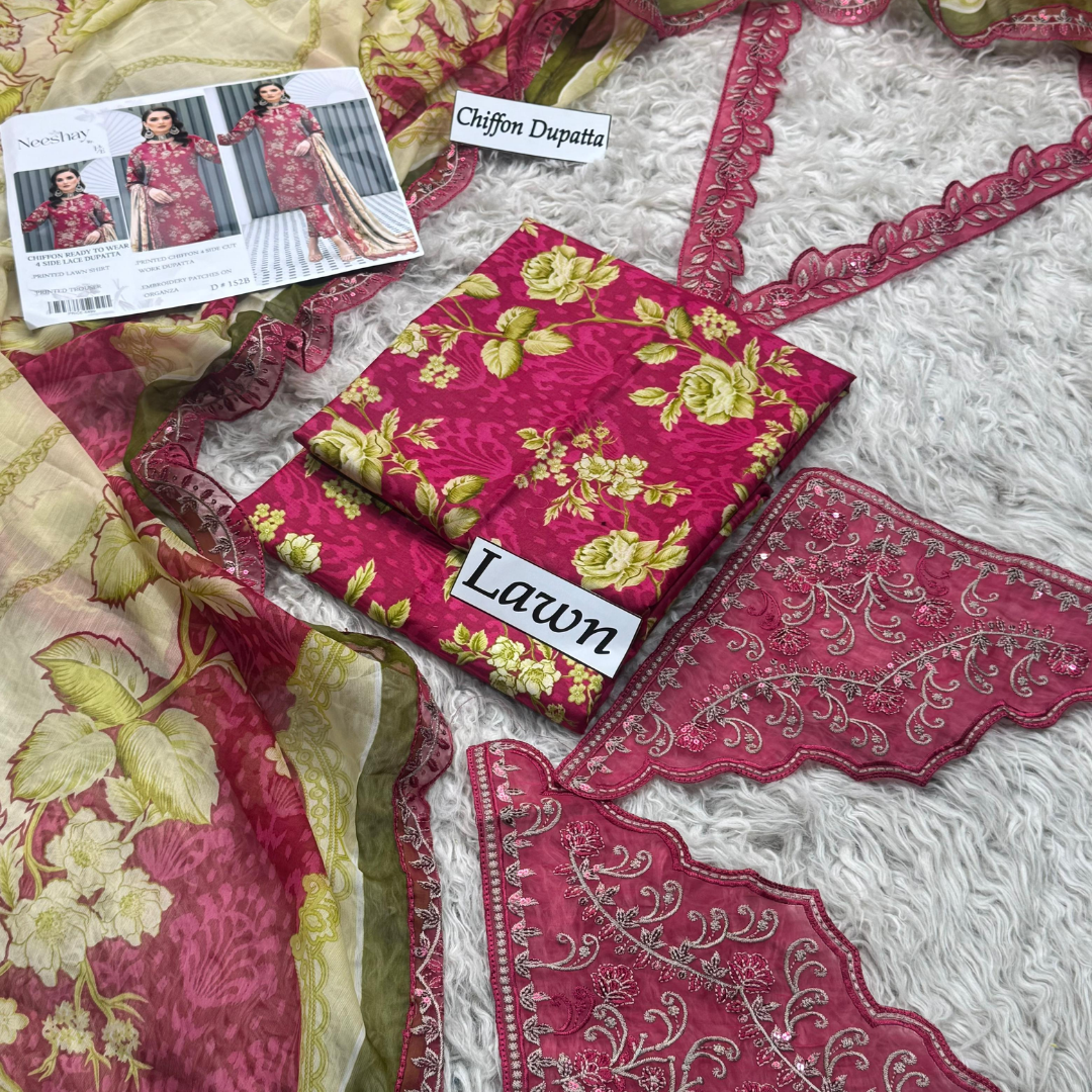 The highlight of this ensemble is the ready-to-wear chiffon dupatta, beautifully finished with four-sided embroidery that enhances the overall elegance of the outfit. The addition of heavy embroidered organza patches further elevates the design, adding depth, richness, and a premium designer feel.