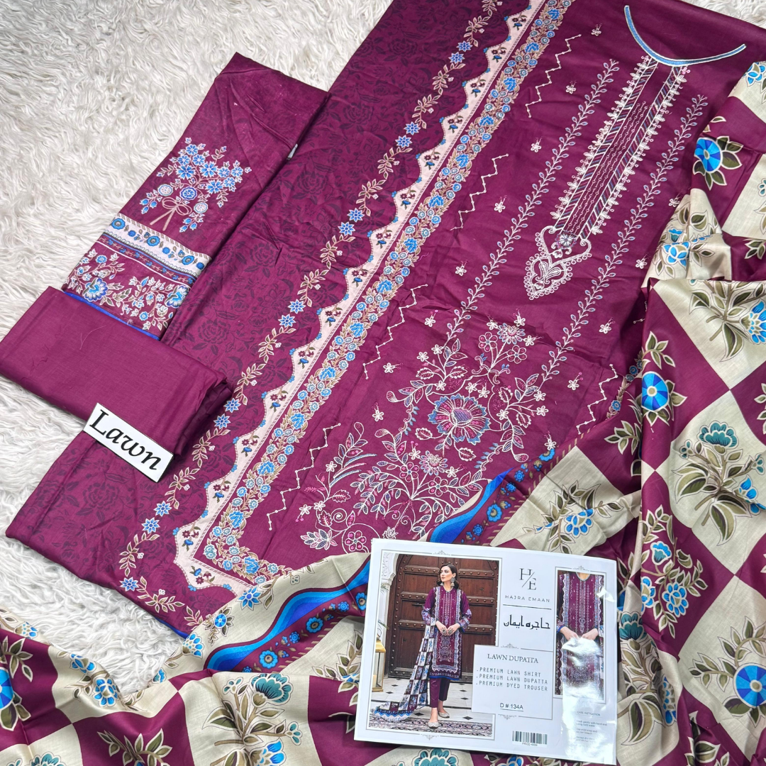 Made from premium lawn fabric, the suit ensures exceptional comfort throughout the day. The breathable and lightweight material feels gentle on the skin, making it a perfect choice for summer. The printed lawn dupatta adds elegance with its soft texture and stylish pattern, while the dyed lawn trouser provides a comfortable and polished finish.