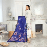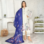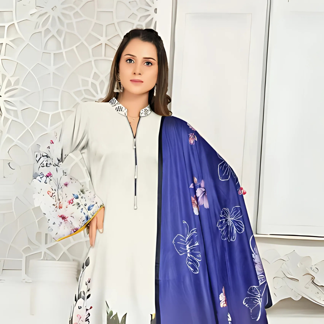 A graceful 3-piece unstitched lawn suit featuring heavy digital embroidery, Voil Zaree dupatta, and fine dyed trousers — perfect for elevating your summer wardrobe with luxury and style.
